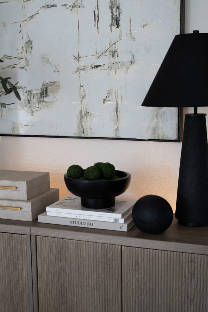 Next, I layered in tall cylinder vases for a bit of drama and some lush greenery to freshen things up. Shagreen boxes? Yes, please! They’re gorgeous and functional, offering extra storage while looking effortlessly chic. For lighting, I went all-in: backlighting behind the cabinets for a moody, dramatic effect and a tall table lamp to warm up the whole space.