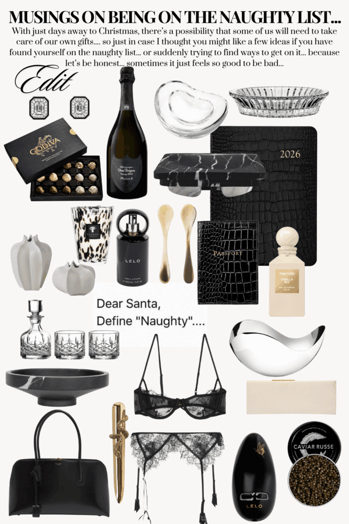 I used to think being on the naughty list was a very bad thing, but as you get older you realize there are degrees of naughtiness and a little bit of it goes a long way in making life a lot more fun. So, I created a little gift list for those who might have found themselves in gray matter with Santa… or even just on the dark side! 🙂 Someone once told me that “a little naughtiness wasn’t such a bad thing” and I’ve remembered that ever since. So, for all my girlies who like to keep a bit of naughtiness, I hope you will enjoy shopping for yourself and others and treating yourself to a little reminder that, when all else fails, the best part about being an adult is not having to make a list for Santa… because that’s what your credit card is for! (Insert evil.. bwahahaha!)