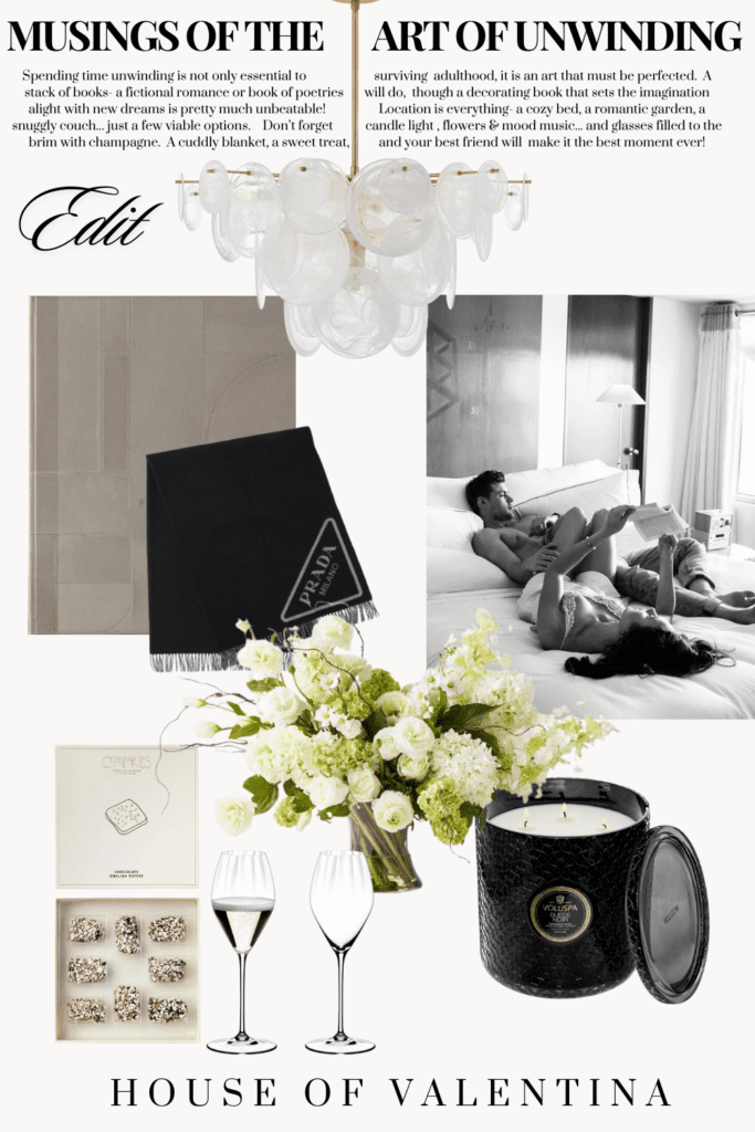 I’ve been thinking about the art of unwinding- those moments in life that we find that help us decompress and recuperate and rejuvenate. Whether it’s a long bath, a walk in a beautiful garden, a slow morning spent lingering in bed, or a snuggle fest on the sofa… the weekend is the perfect excuse to indulge yourself.