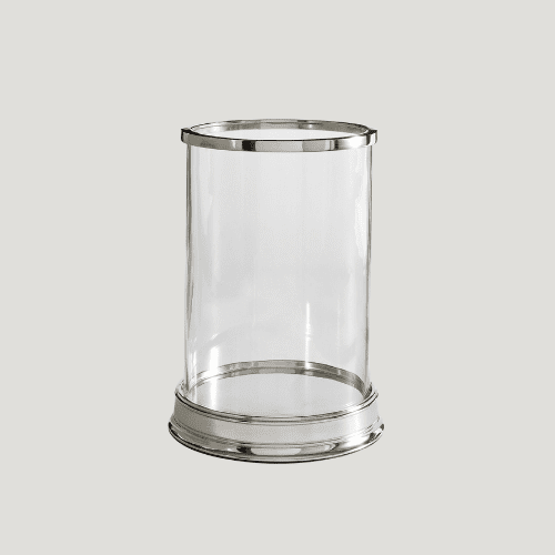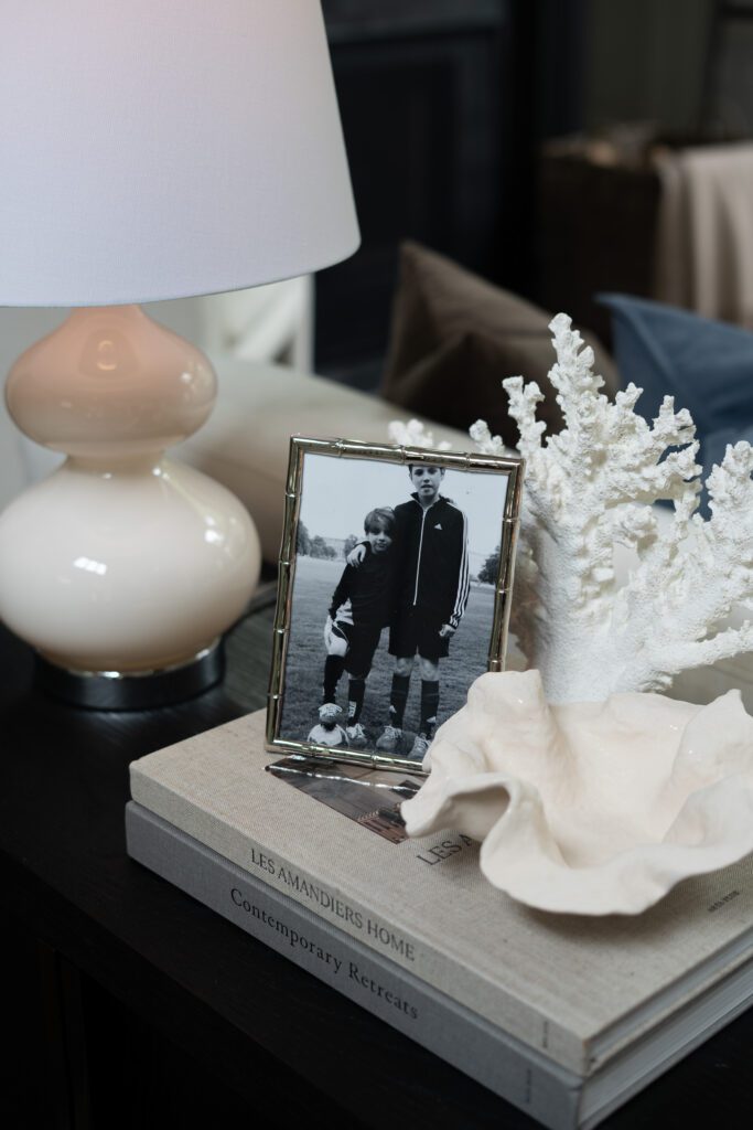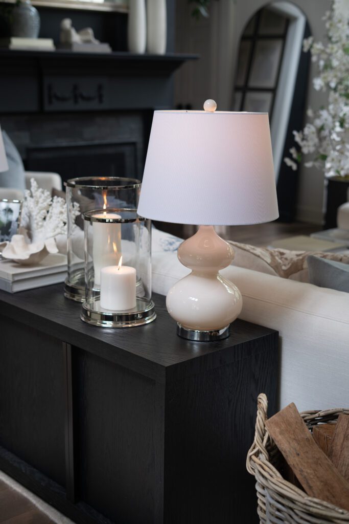 They are creamy and glossy and sculptural and they look absolutely gorgeous flanking the console — paired with stacked coffee table books, a bamboo frame with a black and white photo of the boys, a white coral piece, and glass hurricanes with pillar candles glowing between them. The whole vignette just sings.