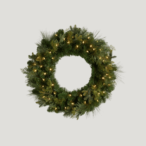 Wreaths hang in the windows like jewelry, framing the winter backdrop outside and turning the entire room into a glowing snow-globe moment. And just beneath the tree, the wrapped gifts peek out in rich plaids and velvets — perfectly moody, perfectly festive.