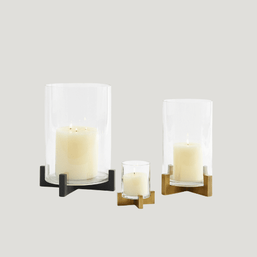 The coffee table feels like a miniature winter story all on its own: flickering candles nestled in hurricanes filled with pinecones, warm brass accents, and a wild, textural arrangement of fresh greenery that brings the outdoors in.