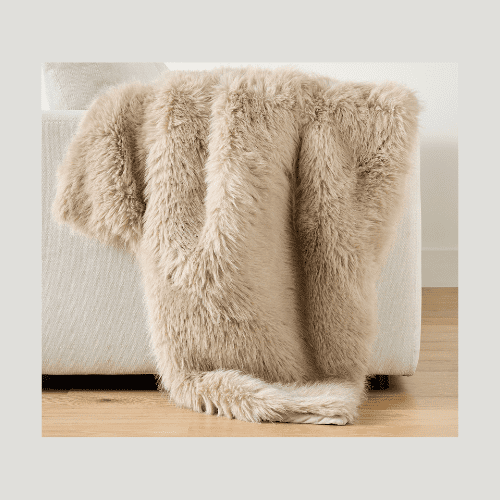 Cozy textures are everywhere — the plush faux-fur throw casually draped over the chaise, the cable-knit pillows, the soft woven blankets tucked into baskets. Everything in this room invites you to curl up, get lost in the moment, and let the season take over.