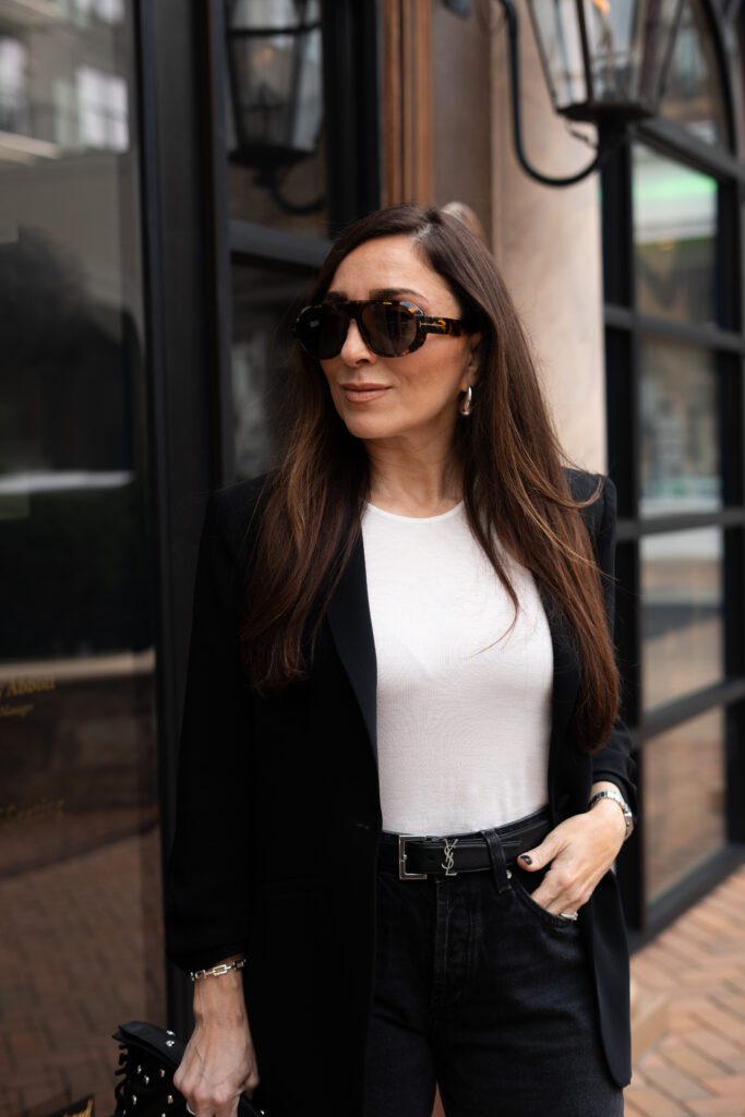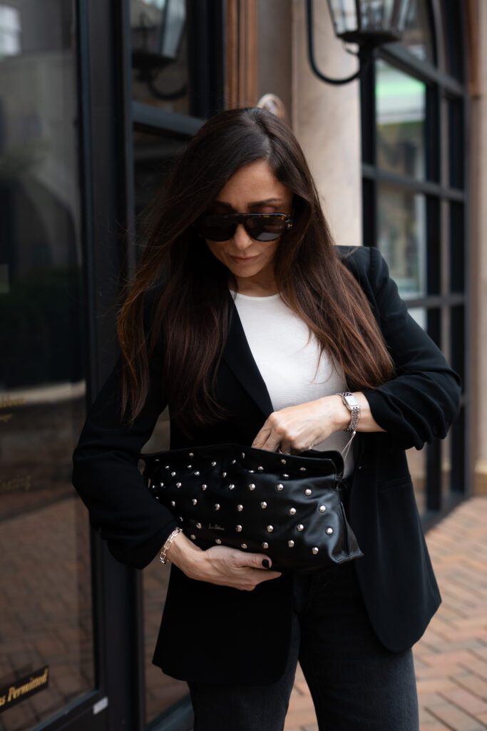 I want my clothes to show up for me the same way I show up for everyone else. This look is modern, chic, and secretly cozy (the holy trinity). A sharp black blazer over a simple white tank? Always a power move. Relaxed black jeans that feel effortless but polished? Yes please. And that studded clutch? She’s bringing a little attitude—and I fully support that energy.